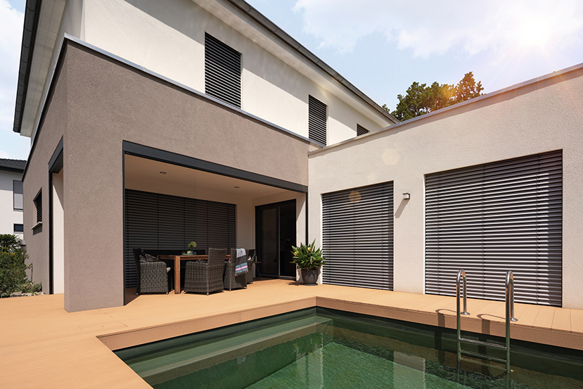 WAREMA Neubau-Aufsetz-Außenjalousien werden gemeinsam mit dem Fenster eingebaut. Dabei integrieren sie sich unauffällig in die Fassade und lassen sich hervorragend mit WAREMA Neubau-Aufsetz-Rollläden kombinieren. Ein optimierter Kastenaufbau reduziert den Lärmpegel von Draußen und verbessert die Schallschutzwerte deutlich. Damit gehören die, zusammen mit dem Fenster zu montierenden Systeme, zu den leisesten am Markt.